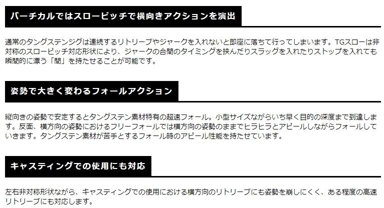 通常のタングステンジグは連続するリトリーブやジャークを入れないと即座に落ちて行ってしまいます。TGスローは非対称のスローピッチ対応形状により、ジャークの合間のタイミングを挟んだりスラッグを入れたりストップを入れても瞬間的に漂う「間」を持たせることが可能です。